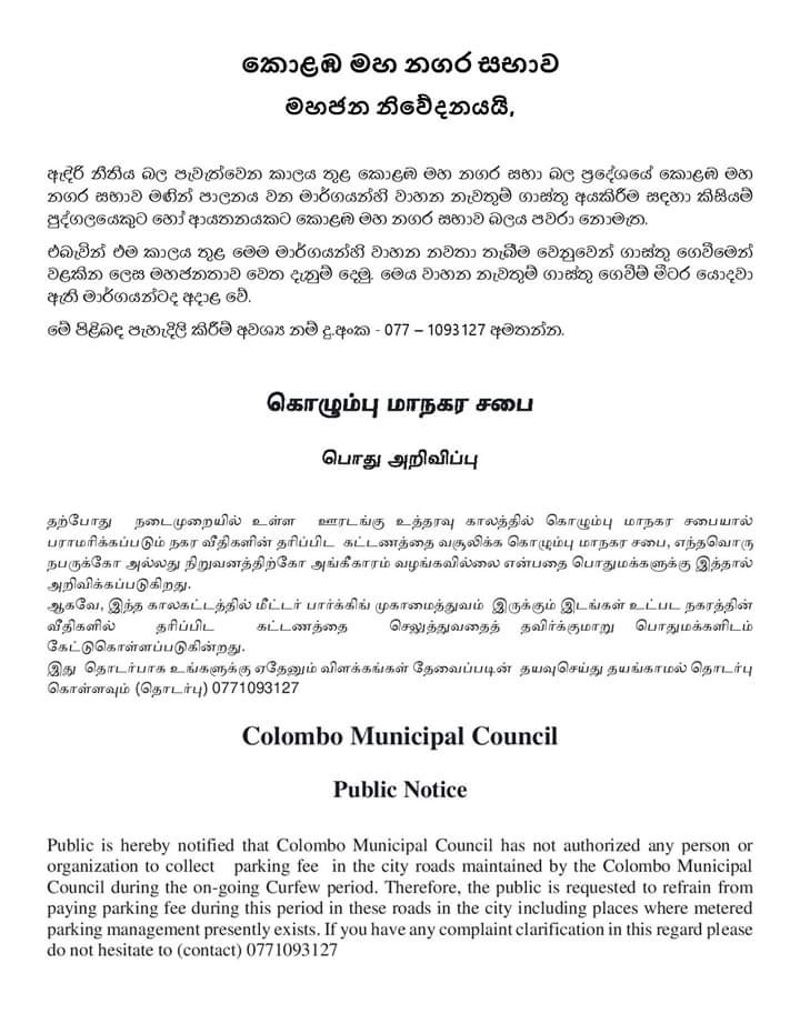 தற்போதுள்ள ஊரடங்கு உத்தரவு காலத்தில் கொழும்பு மாநாகர சபையினால் பராமறிக்கப்படும் நகர வீதிகளின் தரிப்பிட கட்டணங்களை அறவீடுவதற்கு எந்த ஒரு நபருக்கோ அல்லது எந்த ஒரு நிறுவனத்திற்கோ வழங்கப்படவில்லை என கொழும்பு மாநகர சபை அறிவித்துள்ளது.