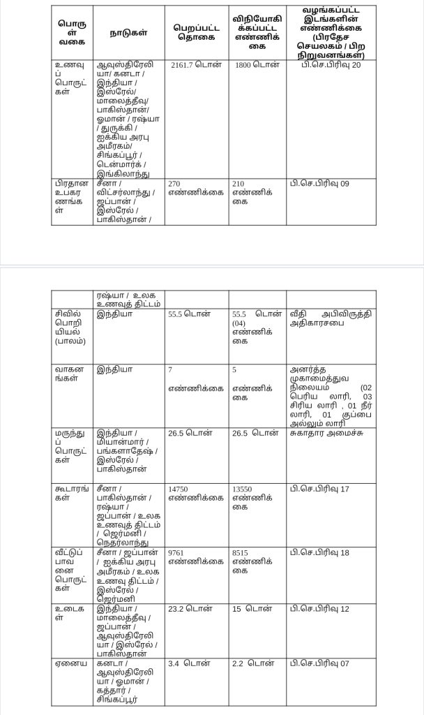 அதன்படி, விமான நிலையங்கள் மற்றும் துறைமுகங்கள் வழியாக நாட்டிற்கு வரும் அனைத்து வெளிநாட்டு உதவிகளும் ஒருகொடவத்தை களஞ்சிய வளாகத்தில் பாதுகாப்பாகவும் முறையாகவும் களஞ்சியபப்டுத்தப்பட்டு வருகின்றன.