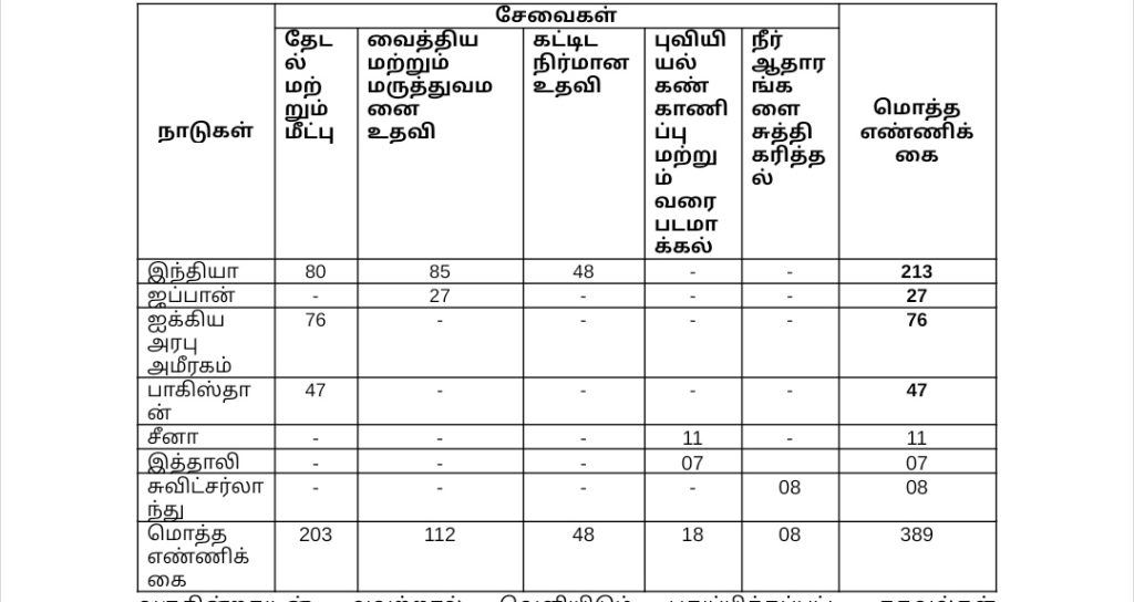 மேலும், நவீன தொழில்நுட்பங்களை பயன்படுத்தி, அனர்த்த நிலைமைகளை கண்காணித்தல், பாதிக்கப்பட்ட பகுதிகளை வரைபடமாக்கல், மற்றும் குடிநீர் சுத்திகரிப்பு சேவைகள் உள்ளிட்ட பல அத்தியாவசிய சேவைகளையும் இக்குழுக்கள் வழங்கியுள்ளன. தங்களது பணிகளை வெற்றிகரமாக நிறைவு செய்த சில நிவாரணக் குழுக்கள் தற்போது நாட்டை விட்டு வெளியேறியுள்ளன.