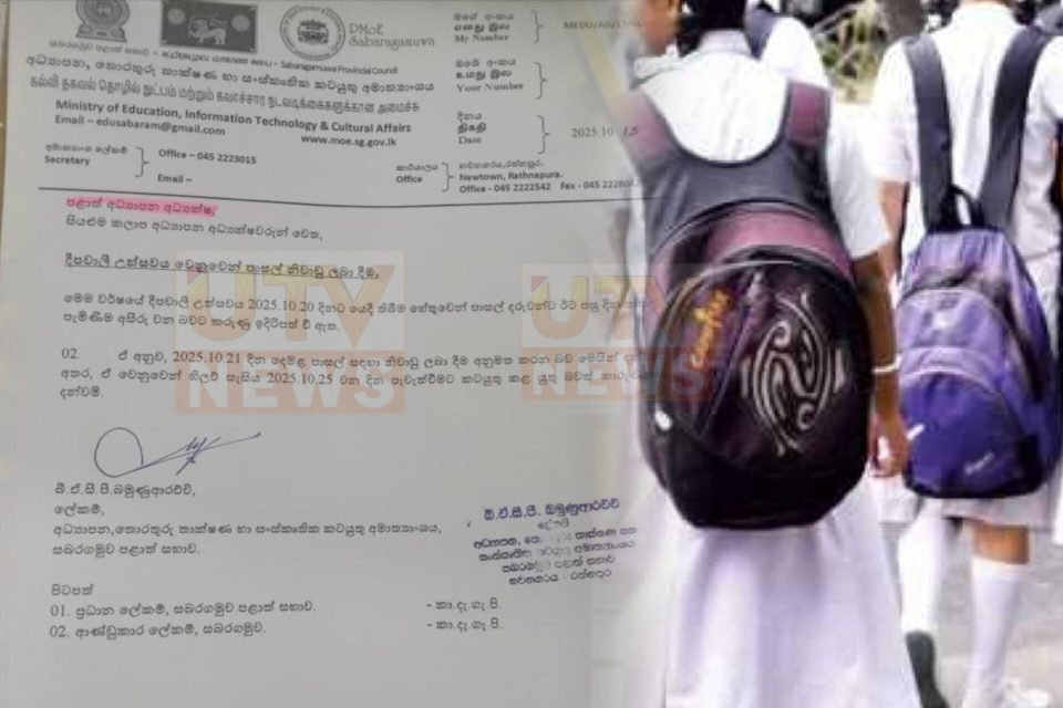 மேற்படி தீபாவளி தினத்திற்கு மறுநாளான எதிர்வரும் 21 ஆம் திகதி தமிழ் பாடசாலைகளுக்கு விடுமுறை வழங்கப்படுவதால் அதற்கு பதிலாக எதிர்வரும் 25ஆம் திகதி சனிக்கிழமை பாடசாலையை நாடாத்துமாறும் மற்றும் இது சம்பந்தமாக சப்ரகமுவ மாகாணத்தில் உள்ள சகல தமிழ் பாடசாலைகளுக்கும் கடிதம் மூலம் அறிவித்துள்ளதாகவும் சப்ரகமுவ மாகாண கல்வி அமைச்சின் செயலாளர் சாமர பமுனுஆராச்சி தெரிவித்துள்ளார்.