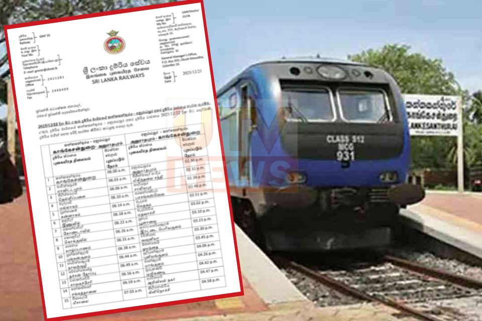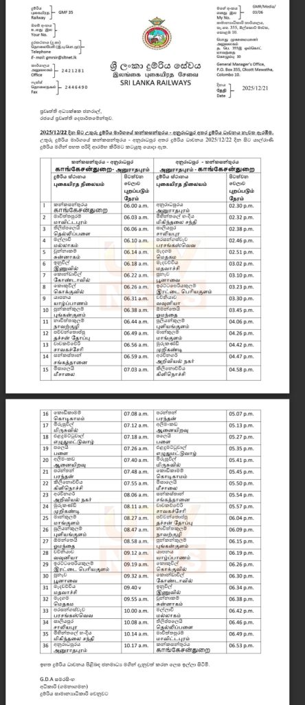 இதற்கமைய, காங்கேசன்துறையிலிருந்து அனுராதபுரம் வரையும், அனுராதபுரத்திலிருந்து காங்கேசன்துறை வரையும் முன்னெடுக்கப்படவுள்ள நாளாந்த ரயில் சேவைக்கான நேர அட்டவணை கீழே தரப்பட்டுள்ளது: