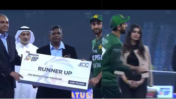 ஆசிய கிரிக்கெட் கவுன்சில் தலைவர் மோஷின் நக்வியிடமிருந்து பரிசுத் தொகையைப் பெற்றுக்கொண்ட சில நொடிகளிலேயே, தனது விரக்தியை வெளிப்படுத்தும் விதமாக, அந்தச் செக்கை அவர் அங்கேயே தூக்கி எறிந்தார்.