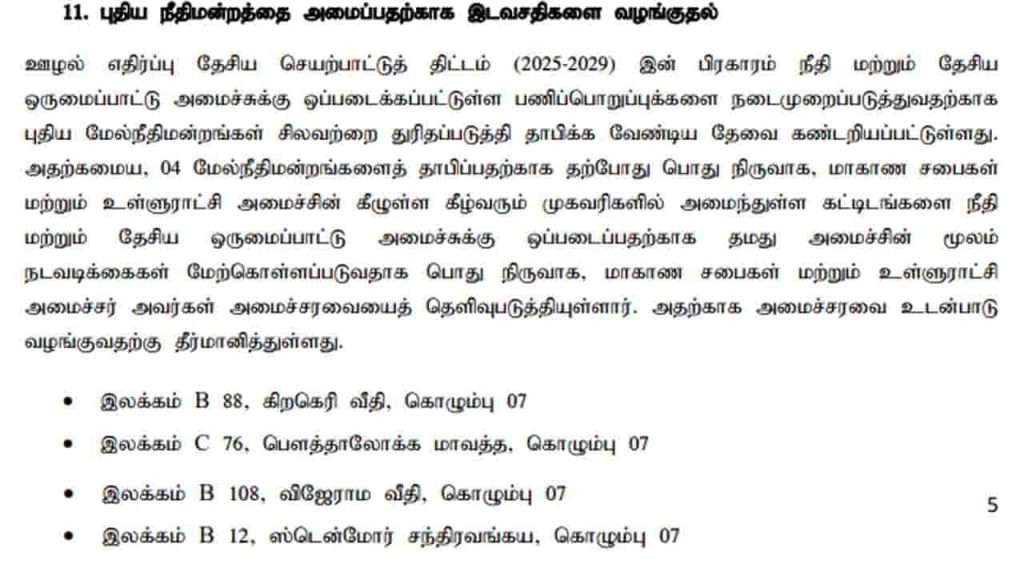 உள்நாடுபுதிய 4 மேல் நீதிமன்றங்களை ஸ்தாபிப்பதற்கு அமைச்சரவை அனுமதி October 28, 2025October 28, 2025129 Share0 புதிய 4 மேல் நீதிமன்றங்களை விரைவாக ஸ்தாபிப்பதற்கு அமைச்சரவை அனுமதி வழங்கியுள்ளது. இதற்காக, பொது நிர்வாகம், மாகாண சபைகள் மற்றும் உள்ளூராட்சி அமைச்சின் கீழ் உள்ள 4 கட்டிடங்கள் ஒதுக்கப்பட்டுள்ளன. அவை பின்வருமாறு: