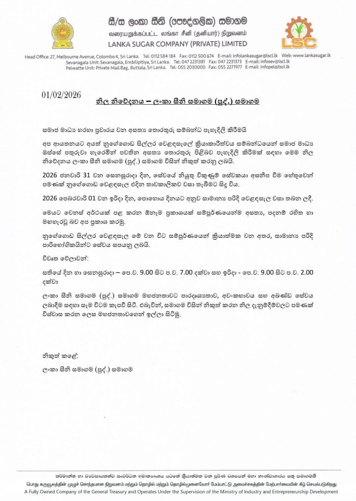 நுகேகொடை சில்லறை விற்பனை நிலையத்தின் செயற்பாடுகள் குறித்து சமூக ஊடகங்களில் பரவி வரும் பொய்யான தகவல்களைத் தெளிவுபடுத்துவதற்காக லங்கா சீனி (தனியார்) நிறுவனம் உத்தியோகபூர்வ அறிவிப்பொன்றை வெளியிட்டுள்ளது.