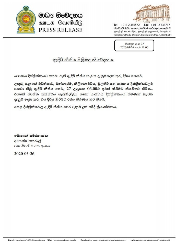 நாளைய தினம் வடமாகாணத்தின் யாழ். மாவட்டம் தவிர்ந்த ஏனைய மாவட்டங்களுக்கான ஊரடங்குச் சட்டம் நாளை காலை 6.00 மணிக்கு தளர்த்தப்படவுள்ளமை குறிப்பிடத்தக்கது.