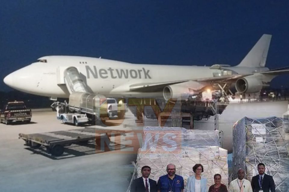 ஐரோப்பிய ஒன்றியத்தைச் சேர்ந்த ஜேர்மனி மற்றும் லக்சம்பர்க் ஆகிய நாடுகளிலிருந்து 5 இலட்சம் யூரோ (500,000 Euro) பெறுமதியான 69,000 கிலோகிராம் எடையுடைய அனர்த்த நிவாரணப் பொருட்களை ஏற்றிக்கொண்டு விசேட சரக்கு விமானம் ஒன்று இன்று (17) அதிகாலை கட்டுநாயக்க விமான நிலையத்தை வந்தடைந்தது.